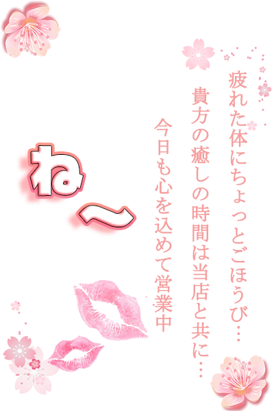 疲れたときはパワーを与えられます。毎日体には相当な負担やストレスが溜っています。疲れを残さないためにも、しっかりマッサージをして疲れを取り除くことが必要です。ついでにお気に入りの子を見つけて、会話や触れ合いを楽しんでいってください。愚痴も聞いてあげられるので気軽にお立ち寄りください!